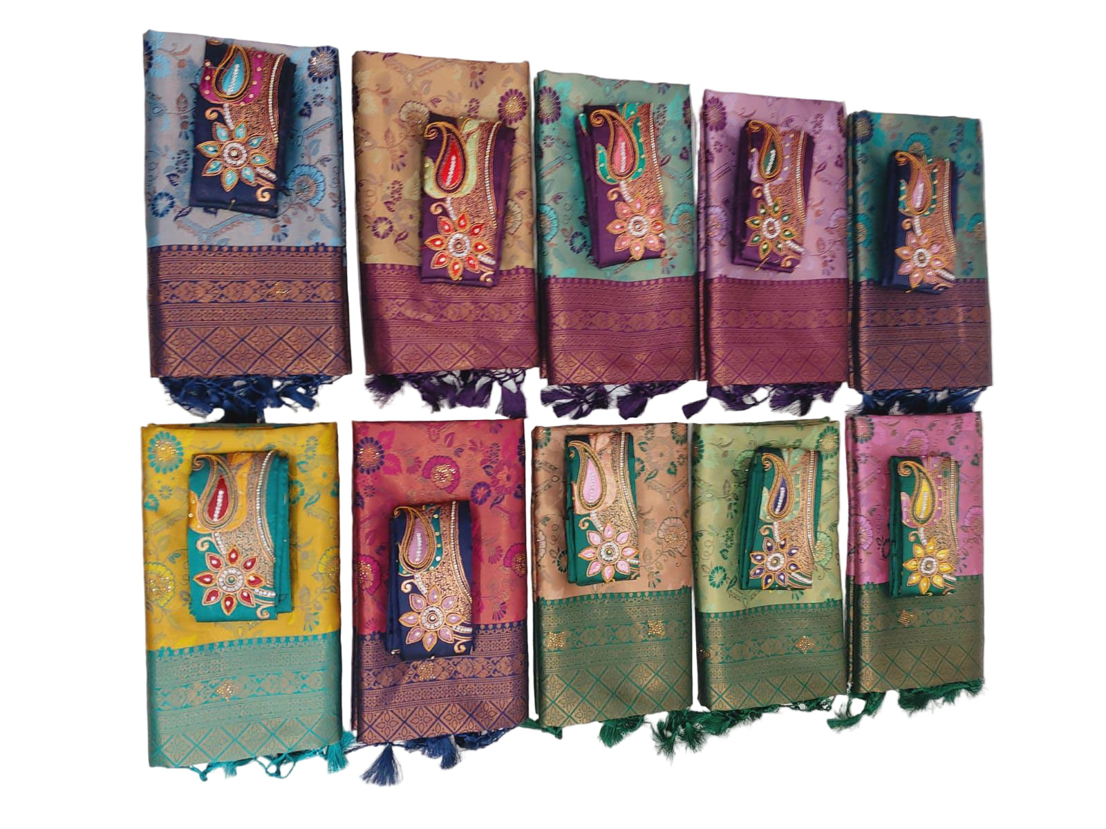 The accompanying blouses are adorned with intricate designs, featuring a mix of floral motifs, geometric patterns, and ornate embellishments that add a touch of sophistication and glamour. Whether you're attending a wedding, a festival, or a formal event, these sarees and blouses are sure to make you stand out.