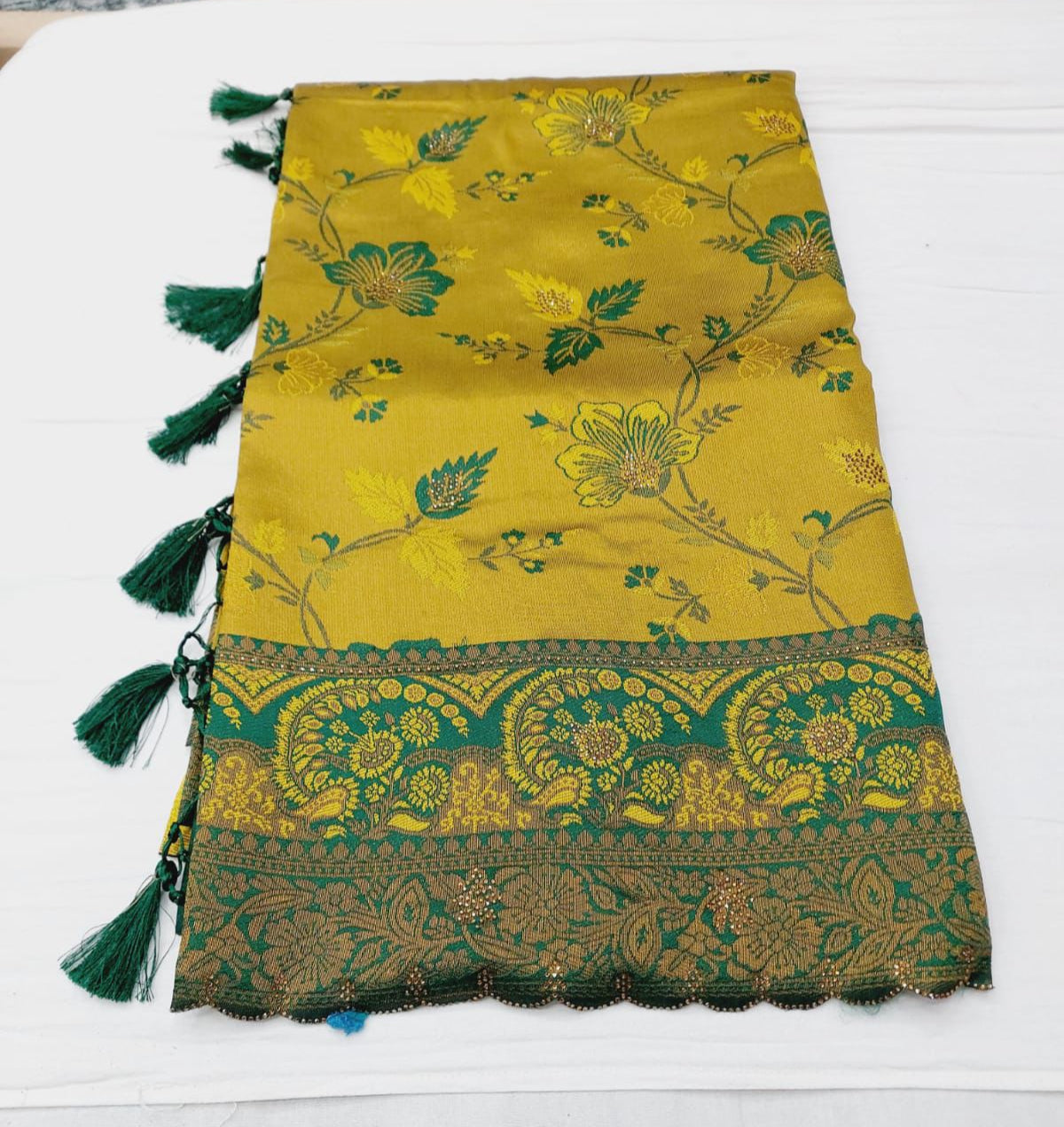 "Elegant Golden Floral Saree with Green Border and Tassels"