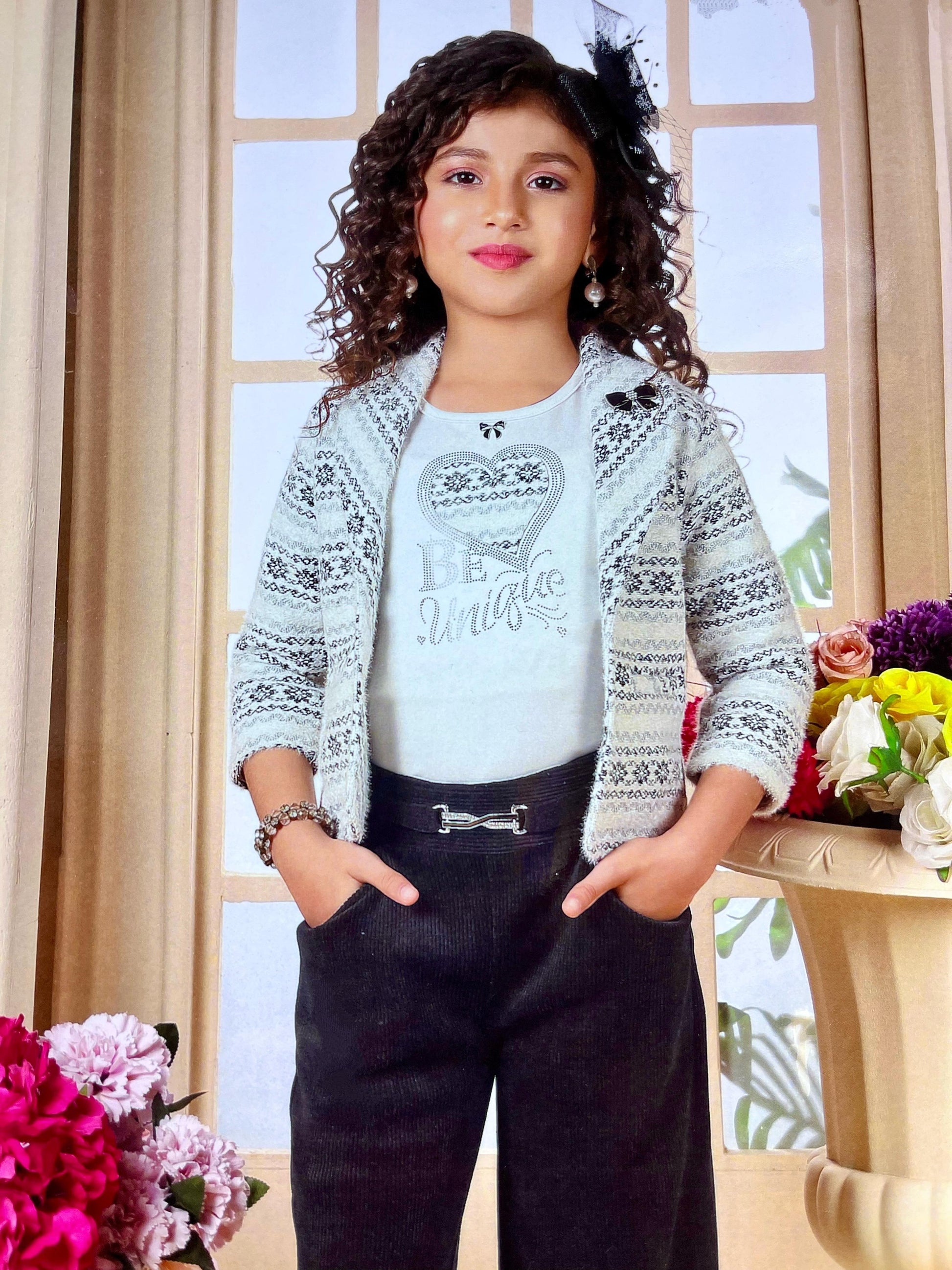 This stylish winter outfit for girls blends comfort with elegance. The look features a cozy, patterned knit cardigan in shades of grey and white, layered over a white graphic tee that proudly displays the message "Be Unique" inside a sparkling heart design. The ensemble is completed with high-waisted, wide-leg black corduroy pants adorned with a sleek metallic clasp at the waist. Accessories include a delicate bracelet, pearl earrings, and a black hair bow with net detailing. White Mary Jane shoes add a classic finishing touch, making this outfit perfect for semi-formal events, family gatherings, or festive photoshoots.